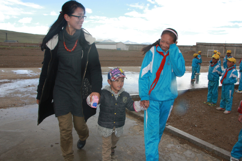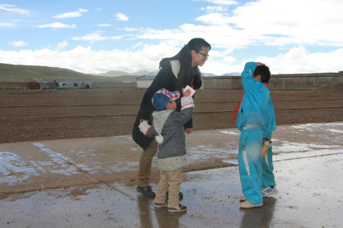 2007年8月援教期滿后,白覺措回到拉薩,在當雄縣納木湖鄉中心小學任教。四千八百米的納木湖鄉中心小學是拉薩市海拔最高的學校。每到冬天,這里都會迎來大風雪。而在大雪封山時,蔬菜是運不進來的。所以,白覺措和其他老師還要利用休息的時間帶領學生們在學校的高寒溫棚內自己種菜,以備不時之需。白覺措淡淡得說道:“這里的夏天是很美,冬天卻讓人受不了。而且夏天并不是天天都是風和日麗,時不時還會來場冰暴。”正說話間,豆大的冰雹就下起來,“噼哩叭啦”打在窗戶上。白覺措急忙起身向外走去,因為正值午飯時間,學生們正朝食堂走向。天冷地滑,怕學生摔倒白覺措拉著自己兩歲半的兒子,站在空地上,對著遠處跑來的學生不停地喊道:“慢點,慢點,小心摔倒!……”。