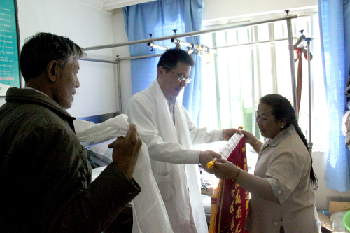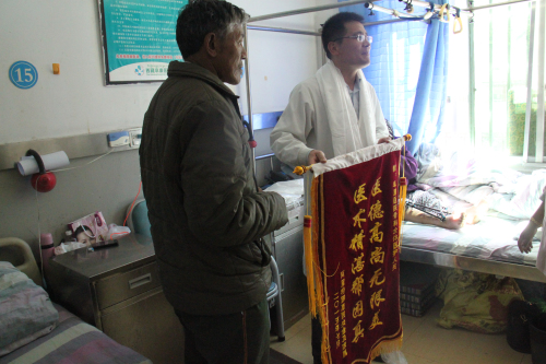 患者及家屬在出院當天,對我院的骨科醫生獻上哈達,錦旗表達了感謝之情。