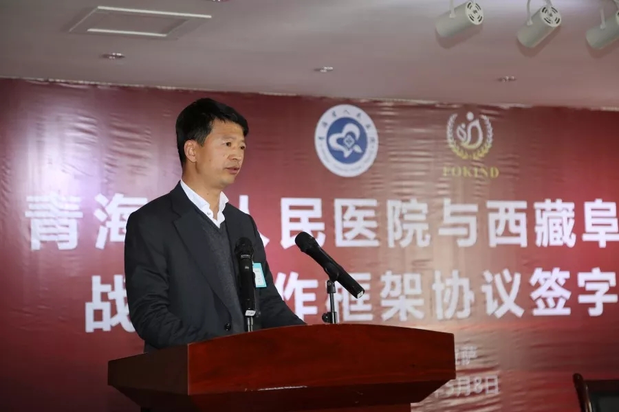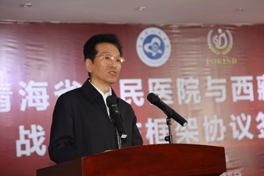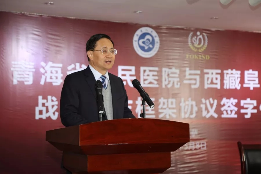 西藏自治區政協副主席、區工商聯主席阿沛·晉源代表自治區工商聯對青海省人民醫院和上海瑞金醫院各位專家的到來表示熱烈歡迎,為青海省人民醫院和西藏阜康醫院戰略合作簽約以及西藏阜康醫院高原健康研究中心正式成立表示熱烈祝賀。
