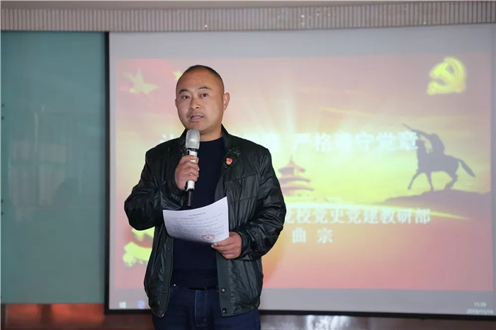 曲宗副教授首先明確了黨章 “根本大法”的地位,指出黨章是規范和指導黨的工作、黨內活動、黨的建設的根本依據。隨后曲宗副教授介紹了黨章的歷史沿革,以及十九大修改黨章的歷史意義和重要內容,號召每一名黨員認真學習黨章,嚴格遵守黨章,時刻與黨中央保持一致,自覺做到“兩個維護”。要求每一名黨員都把黨章作為政治思想建設方面的X光機,每年對照黨章給自己“體檢”一下,紅紅臉、出出汗,牢記入黨初心、遵守黨的紀律,維護一名黨員的思想行為純潔性。