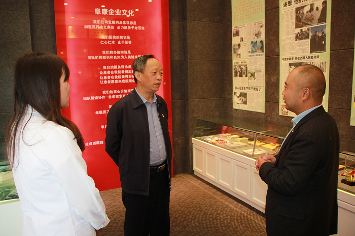 在阜康醫院五樓院史館,劉連福向劉家杰一行介紹了阜康醫療不平凡的發展歷程以及阜康人在黨的建設、抗震救災、公益事業、企業文化等方面的成就,劉家杰一行對阜康醫療各方面的工作表示充分認可并對“阜康”中所含的物阜民康——“物產豐富,民族安康”之意表現出極大的興趣,希望通過阜康人在醫藥領域的不懈努力,勇于攀登醫學高峰,為西藏的醫療發展貢獻力量。