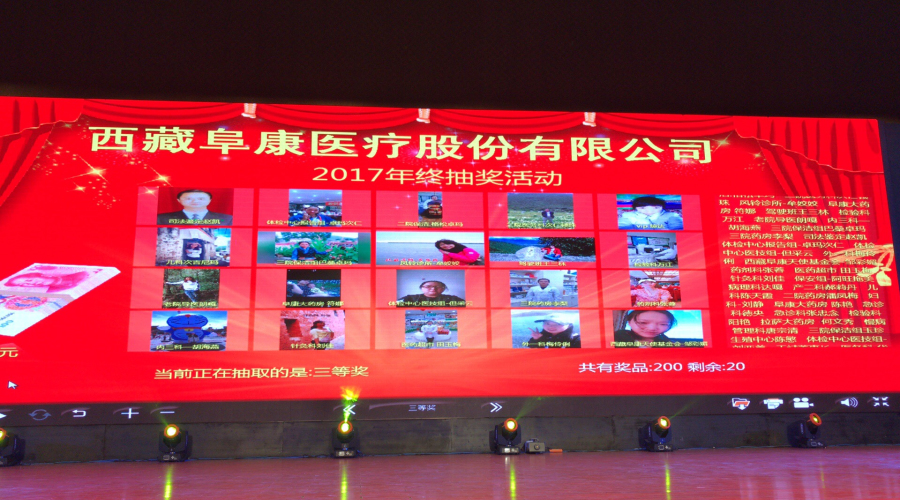 2018年1月10日,西藏阜康醫療股份有限公司新年團拜會在拉薩洲際酒店舉行,下午四點來自西藏阜康醫院、婦產兒童分院、心腦血管分院、健康體檢中心,阜康大藥房、超市的員工陸續來到會場。下午五點,主持人劉連福院長宣布會議正式開始,場內音樂響起,董事長王斌帶領醫院領導和特邀嘉賓入場,會場立刻響起雷鳴般的掌聲和歡呼聲。