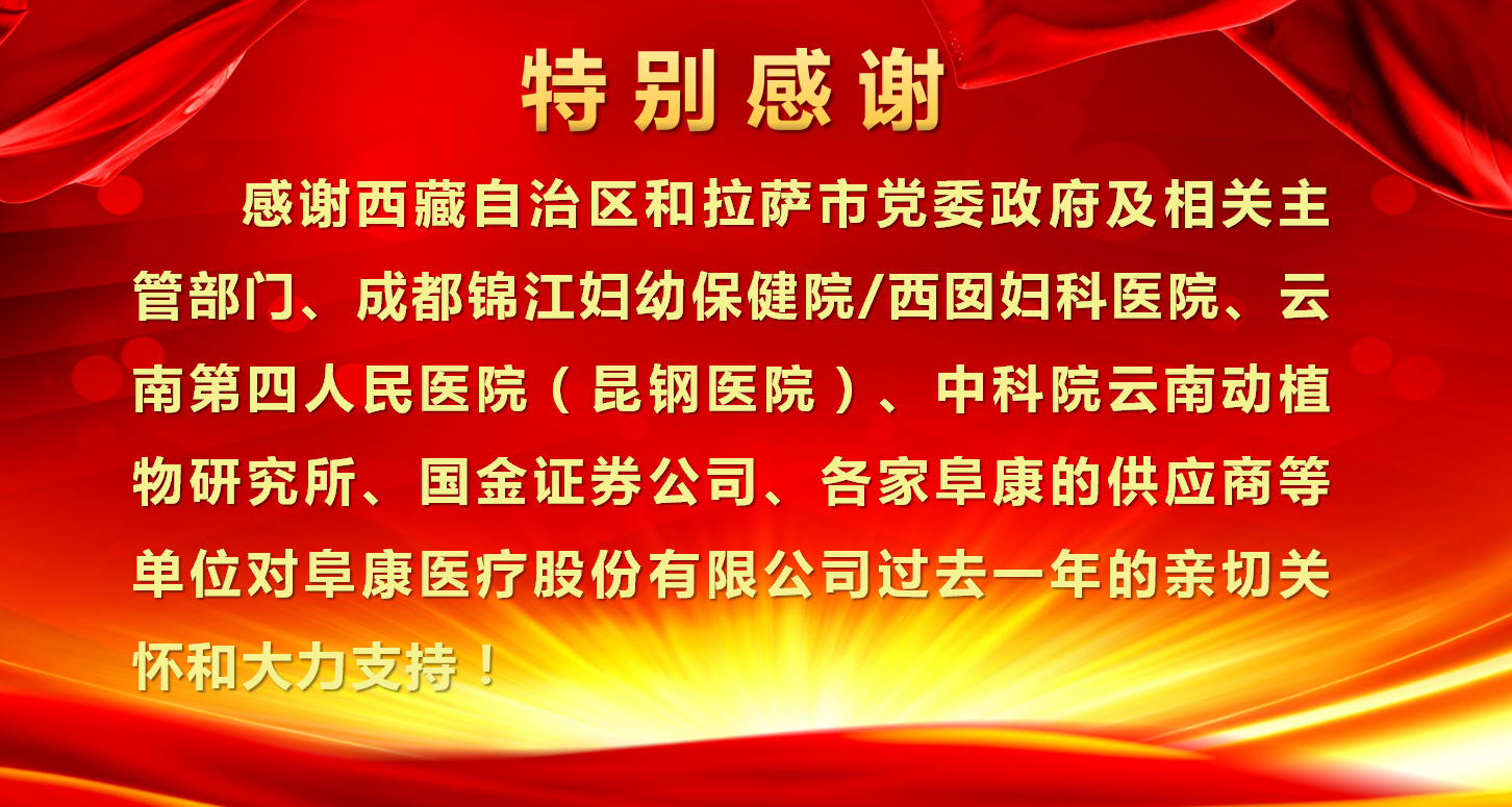 我之存在,因為有你;百年阜康,感恩有您。感恩是一種態度、一種美德、一種情懷!不忘初心、砥礪前行,感謝你們的一路陪伴,阜康的輝煌離不開每一位阜康人的奉獻,雄關漫道真如鐵,而今邁步重頭越!2018年將是阜康騰飛的一年,在各級領導關心下,各位同仁支持下,阜康一年更比一年好!以十九大精神為指導,努力打造“團結、創新、規范、節約、用心”五位一體的現代化醫院!為西藏人民群眾解決看病遠、看病難、看病貴的問題,全心全意為西藏人民健康服務!