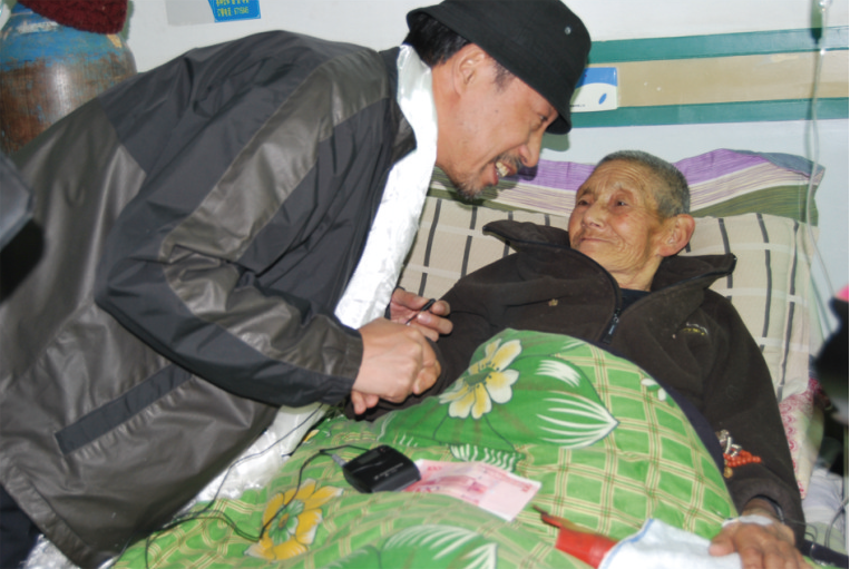 這次感恩之旅最艱難的地方就是大家對西藏高原氣候的極度不適應。果然, 到達了西藏后,孫海英就發生了嚴重的高原反應, 身體虛弱到了極點。同行的工作人員為了防止意外,一度打算取消這次探訪。但孫海英請求大家稍等自己一會。半個小時后,經過簡單救治以后,盡管他的不適反應并沒有完全消除,但孫海英仍然準時出現在大家面前。