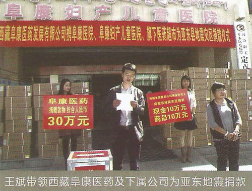 到了2000年,注冊成立了西藏阜康醫藥發展有限公司,下設阜康醫院、阜康大藥房和拉薩大藥房等8個分公司。從最初的一間藥房起,到創辦西藏阜康醫院。做為一名從醫者王斌說:“醫者父母心”,醫生要有一顆仁慈的心善待患者,應視病人為親人、為自己的父母姐妹。在王斌的帶領下阜康醫院在注重兩個效益的同時,時刻不忘回報社會在制定醫療收費標準方面參照拉薩市醫療收費標準的基礎上再下調20%,對藥品定價按照物價部門規定的價格水平下調15%,是目前拉薩市醫療收費標準最低的,同時還取消了門診、急診等一系列費用。對經濟困難的病員實行減少或免費治療,到至今在阜康醫院從沒出現過因病人無錢付醫療費而得不到治療的現象。并在醫院員工制度上推出七條禁令“嚴禁見死不救、嚴禁推諉病人、嚴禁收受病人紅包、嚴禁私扣病人藥品”等各種制度保障病人利益不受侵犯。從2005年4月28日開業始,幾年來阜康醫院對經濟有困難的門診、急診病人實行減免醫療費用人數達560多人次,“惠民病房”優惠幅度達50%,減免優惠金額達64余萬元,同時還采取各種形式送醫、送藥下鄉,到孤兒院、養老院、殘疾人學校等免費送醫、送藥、資助等。
