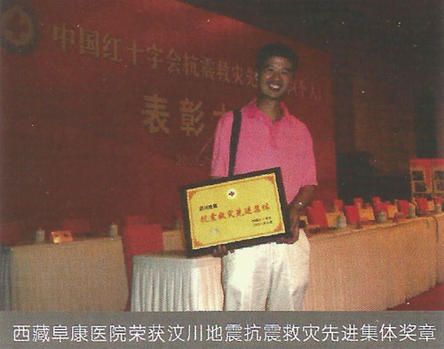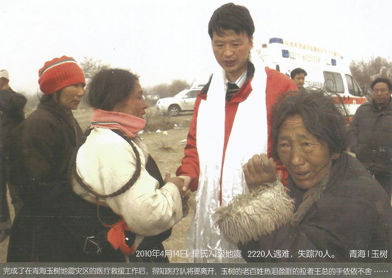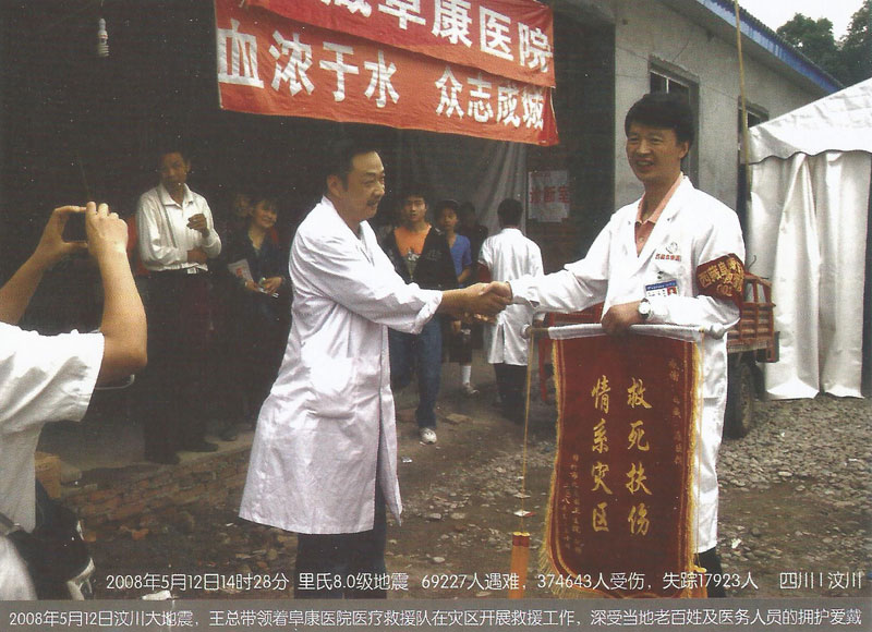 2008年5月12日14時28分,在得知發生在四川汶川8級的強烈地震后,王斌被深深的震撼了,5月13日第一時間帶頭捐款并號召全公司347名員工為災區人民獻愛心,在王斌的帶領下短短的一上午公司即向西藏紅十字會捐款10062萬元(其中王斌個人捐款5062萬元)。13日下午,王斌隨即召開阜康醫院醫務人員趕赴災區醫療救援動員大會,并迅速組建了一支由他本人作為領隊的26人醫療救援隊。同時他還帶領醫療隊為盡快抵達地震災區并第一時間參與醫療救援,而且決定在成都臨時購買一輛配備完善的救護車,還包括大量藥品、生活物品、以及部分醫療設備,此次救災共投入130余萬元。