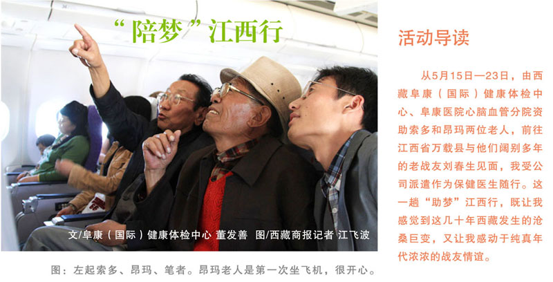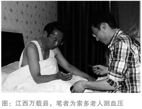 我們5月15日從拉薩出發(fā),一路向東,到成都轉(zhuǎn)機(jī),兩天的時間,已經(jīng)跨越了2400多公里。16日,載著夢想的飛機(jī)抵達(dá)了江西南昌機(jī)場,劉春生老人的大兒子在機(jī)場熱情地迎接我們,將我們接到老人的故鄉(xiāng)萬載縣。我們決定在縣城賓館休息一天后再啟程前往劉春生老人的家,于是我為同行的兩位老人做了全面的檢查,索多老人的血糖在7.0mmol/L左右,令我擔(dān)心的是昂瑪老人血壓本來就偏高而且又是第一次去內(nèi)地,他的血壓波動在140-150/90-100mmHg,比較平穩(wěn),我叮囑老人見面時注意控制情緒,不要過于激動。
