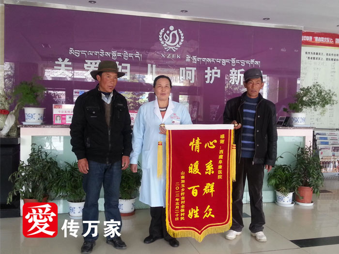 2013年5月22日阜康婦產兒童醫院門診大廳,山南加玉鄉桿吉村的塔杰書記激動地握著呂果梅院長的手,不停地說著感謝的話,他的身邊站著桿吉村的扎西村長,村長手上拿著一面錦旗,錦旗上面寫著“心系群眾 情暖百姓”。