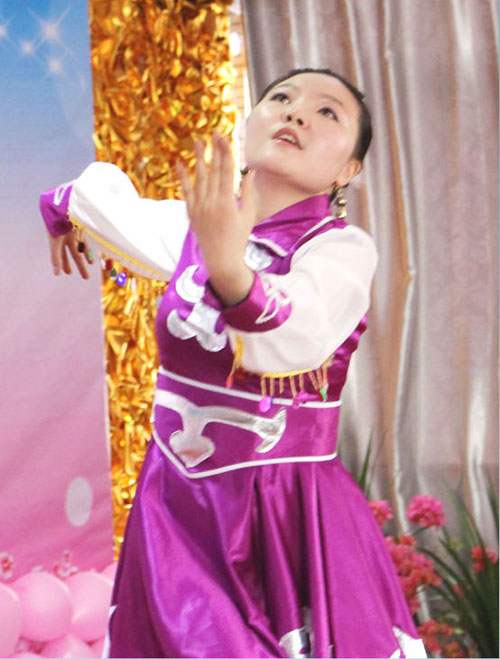 丹丹告訴筆者,之所以會(huì)選擇“鴻雁”這支舞蹈,是因?yàn)橄矚g上了“鴻雁”那首歌,歌聲悠揚(yáng)婉轉(zhuǎn),仿佛把她帶到了大草原,看到了美麗的牧羊姑娘,看到了悠閑的馬兒,看到了像白蓮花般盛開的氈包……因?yàn)檎也坏胶线m的舞伴,丹丹只好把這支集體舞改成了獨(dú)舞,練習(xí)中她不是純粹的模仿,也會(huì)適當(dāng)?shù)馗木帯>毩?xí)鴻雁時(shí)自己傷佛也變成了一只北歸的大雁,那是一種很奇妙的感覺(jué)。能夠在此次演出中獲得大家的認(rèn)可更是堅(jiān)定了她練習(xí)舞蹈的決心,丹丹表示會(huì)繼續(xù)練習(xí)舞蹈,爭(zhēng)取在下一次的演出中帶給大家更美的視覺(jué)盛宴。