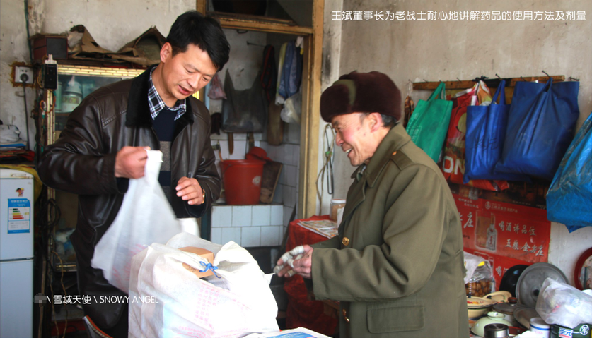 老同志開了一個小小的雜貨鋪,主要經營一些食用油、罐頭之類食品。原本不大的店面加之已是很陳1舊的招牌,使得這間雜貨鋪更為不顯眼。羅老同志見王斌先生來看望他,很是高興,就像是見到親人一般的激動。王斌先生對老同志噓寒問暖,親切地詢問著他的病情,耐心地為他一一講解著這些藥品的使用方法及劑量,一遍一遍地叮囑著要他堅持把有軟化血管作用的補品吃上。當王斌先生準備起身離開時,老人家再次緊緊握住了他的手,感激地說道:“ 謝謝你們還記得我,我打心眼里感謝你們!”