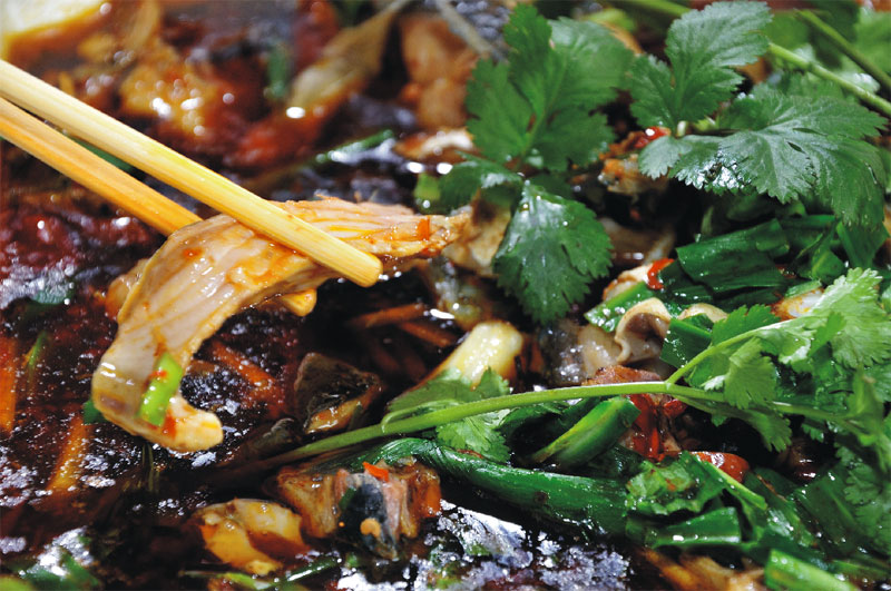 廣東人喜歡煲湯,卻把老火湯里豐富的湯料稱為湯渣,一般只作為正菜前的消遣而已。四川人的燉菜則是絕對的主角,無論是家里的餐桌還是飯店的酒席,一般上了燉菜,也就意味著宴席進入高潮。過去,家里最喜歡做海帶燉雞,老母雞加海帶,拍幾片生姜,扔一束香蔥,快起鍋的時候灑一些鹽,湯清肉香,老遠聞到就忍不住想去揭一下鍋蓋。那時,我最得意的是用小碟子,只放一些干辣椒粉和鹽,舀一小勺雞湯拌勻了,做成蘸水,隨手揭一塊雞皮在蘸水里一裹,滋味純粹而濃烈,讓人每次想起,都忍不住要閉上眼睛猛吸一口氣,仿佛那味道又在舌尖上打轉。