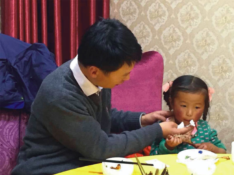 和小卓瑪的時光是快樂而短暫的,剛相聚時,你是那么膽小怕生的,“阿爸”為你穿上新衣服,你開心。“阿爸”對你是那么疼愛、牽掛,把你緊緊抱在懷里,為你剝糖紙,為你卷衣袖,帶你進城看震后城市的新貌,帶你吃大餐,為你擦鼻涕,為你拿你喜愛吃的肉,為你擦手上衣服上的油漬,帶你嬉戲歡天喜地,逗你開心,此時的他,已不再是擁有八百多號員工的企業董事長,他就是你的“阿爸”,一個認為和你在一起時光太短的“阿爸”。