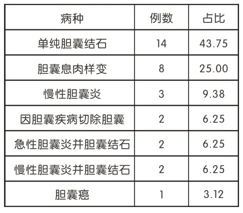 273名體檢者中241例未見明顯膽囊異常,占比為88.28%,32例查出膽囊疾病,占比為11.72%。32例膽囊疾病中單純膽囊結石比例最高,為14例,占比43.75%;膽囊息肉樣變占比第二,為8例,占比2500%;其他10例中,3例為慢性膽囊炎(9.38%),2例為因膽囊疾病切除膽囊(6.25%),2例為急性膽囊炎并膽囊結石(6.25%),2例為慢性膽囊炎并膽囊結石(6.25%),1例為膽囊癌(3.12%),具體見下表。