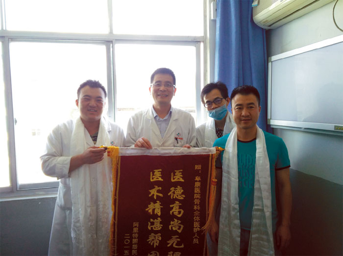 2015年5月23日,外一科收治一名來自曲樂鄉尼雄二村名叫扎西(化名)的病人,診斷為右脛骨開放性粉碎性骨折并大面積皮膚壞死,住院63天,共四次手術。因經濟困難,無法承擔所欠的四萬兩千余元。向上級領導匯報后,王斌董事長指示:先治病,所欠費用由雪域天使基金會補充。出院當天,患者及家屬為我院骨科醫生獻上哈達和錦旗以表感謝之情。