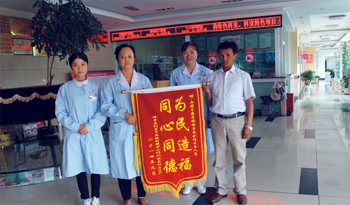 2014年阜康義診隊(duì)奔赴山南地區(qū)隆子縣開展免費(fèi)義診送醫(yī)送藥活動,共有300多名村民就診,發(fā)放藥品2萬余元。為了向阜康醫(yī)護(hù)人員表示感謝,2015年7月30日山南地區(qū)社保局醫(yī)保中心主任邊旦次仁,代表隆子縣列麥鄉(xiāng)西徒村駐村工作隊(duì)及全村88戶村民來到阜康醫(yī)院婦產(chǎn)兒童分院,為我院醫(yī)務(wù)人員送來了感謝錦旗,敖德秀院長作為院方代表接受了這份榮譽(yù)。