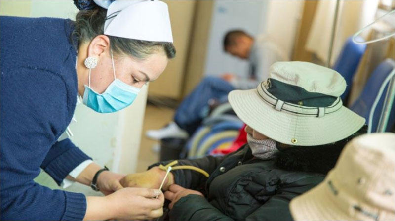來到輸液處,里面已坐滿,過道里也是一長排。真是河里沒魚市上看,每天居然有這么多人生病。我在過道末端的一張椅子上坐下。一會兒,來了位護士,喊名字,問年齡,接著掛瓶用橡皮管扎手臂拍手背找靜脈血管。在西藏,核對身份要姓名與年齡兼顧才可能準確,因為這里的重名率有的高達20%。喊一句旦增,有可能幾個男子同時應答;叫一聲拉珍,幾個女性一起說我在這里;還有單看名字分不出性別的,如男尼瑪、女尼瑪……