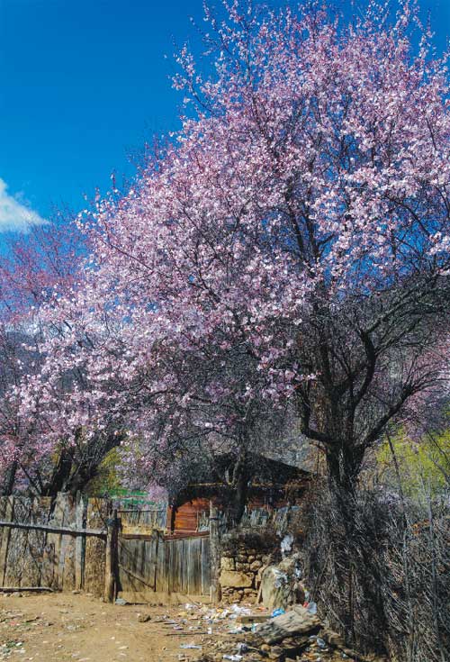 桃花溝對于外人只當(dāng)闖入了陶淵明筆下的“桃花源”,而對于波密人,這只是一個普通的村落。這些桃樹都是野生的,有的上百年,甚至上千年,一個人抱的樹是最常見的,兩三人合抱的也屢見不鮮。這些野桃樹不只是大而且多,田間、屋后、路邊、山中隨處能見到三三兩兩挺立著。最多的是在山坡上,常常是漫山遍野,呼拉拉總有成千上萬的感覺。花色雖柔美,卻從骨子里透出高原的雄渾和雪域驕傲的氣勢,藍(lán)天之下,碧水之畔,妖嬈多姿。每年三月中旬至四月初,漫山遍野的桃花開始鋪滿山坡,綿延至河谷。大株的桃花樹如同桃花仙子,偎依在雪山之下,與云朵相擁,形成密集的桃林。漫步其中,可見雪峰聳立,桃花怒放,清泉嬉戲,藏寨悠然,美到令人窒息。