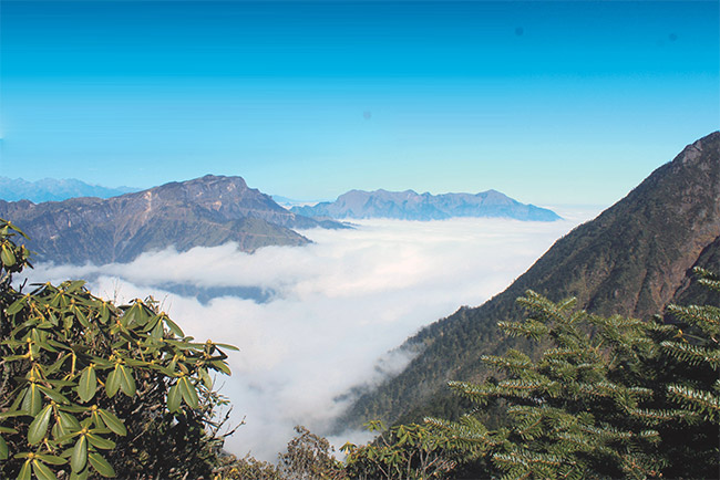 牛背山最令人著迷的便是云海,牛背山的云海,濃密而均勻,壯闊而平緩,隨處可見的瀑布云猶如阿凡達中“哈利路亞山”一般讓人感覺踏步于空中;而環顧四周連綿不斷的群山錯落有致,層次分明,蜀山之王貢嘎雪山矗立于最高點,泥巴山、娘娘山、瓦屋山、峨眉山、夾金山、四姑娘山和二郎山在前,大渡河大峽谷在后,幾乎天府之國的所有名山峻嶺在此時都變成了玲瓏盆景,而翻滾的云霧之下,群山丘陵逐級降低,緩緩融入稻浪翻滾的天府平原。