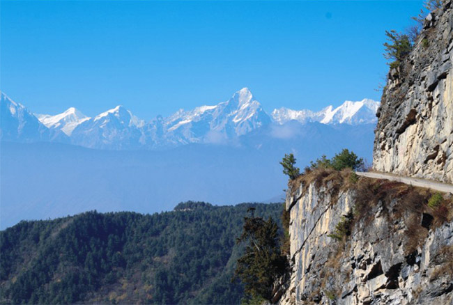前幾天山里一直在下雨,因此道路濕滑,并不好走,我們拄著登山杖,走得很小心,卻仍然免不了摔跤。最初天空陰沉沉的,山間的霧濃得化不開,大家心里免不了有點沮喪,難道這次我們也要帶著遺憾離開嗎?慢慢地,太陽從云層間透出一點點光芒,雖然微弱,卻帶給我們莫大的希望。可它像個調皮的孩子一樣,給你扮個鬼臉后,一會兒又消失不見了。心情再次低落起來,埋著頭一個勁兒往上沖,期望著到了山頂就能是好天氣。誰知這幸運來的如此之快,走到一半時,山里的霧開始逐漸散開,遠處的雪山一點點顯現出來,就像那害羞的姑娘,在千呼萬喚下終于揭開它那神秘的面紗,雪山連綿不斷,一座接著一座,最引人注目的便是貢嘎群山,它們似乎觸手可及,卻又隔著濤濤云海。我們的激動無以言表,原本已疲憊的身體立刻變得精神抖擻,因為前方還有更美的風景等著我們。